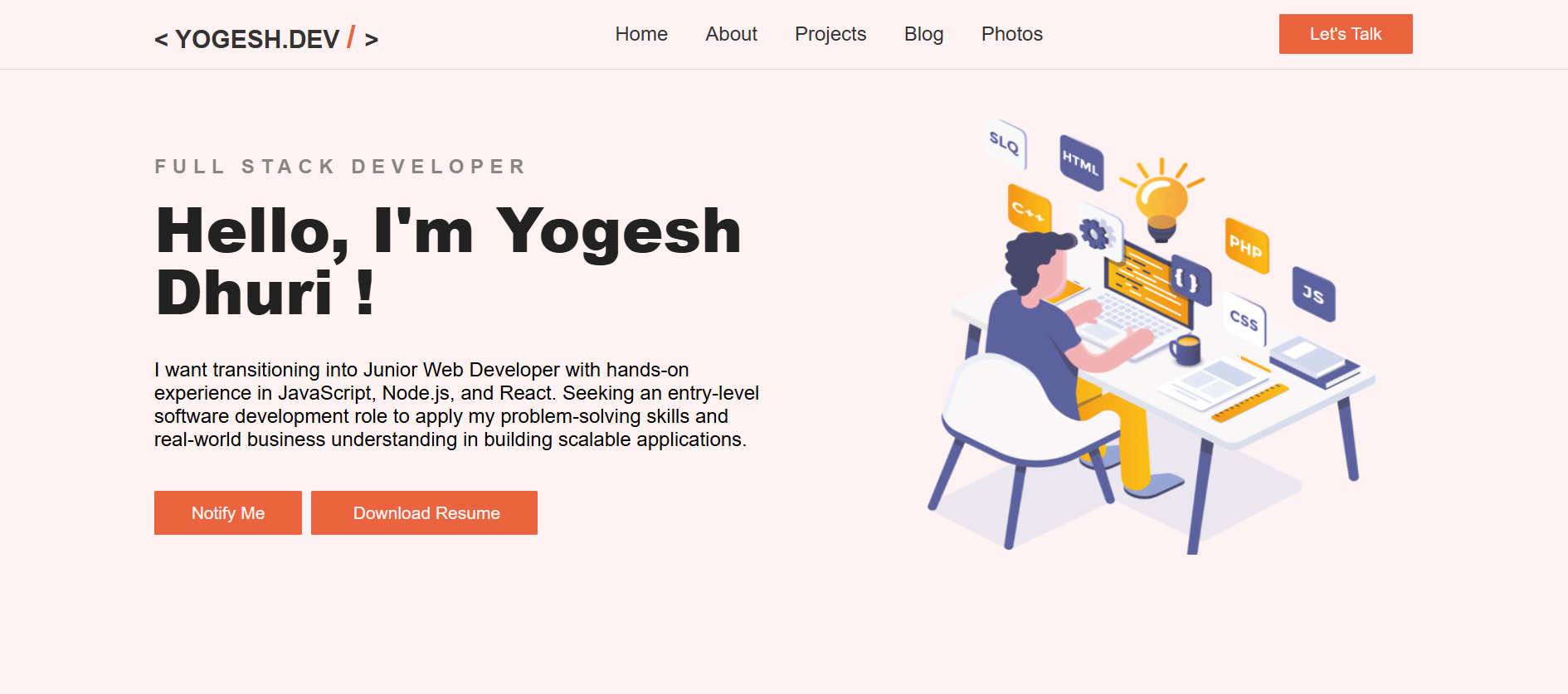 Hi there, My name is Yogesh Dhuri and I'm Full stack web developer having specialization in backend & Front web development. I have backend skills in Node.js, Expess.js. I also have frontend skills in JavaScript, react.js, Web components like css, Bootstraps.